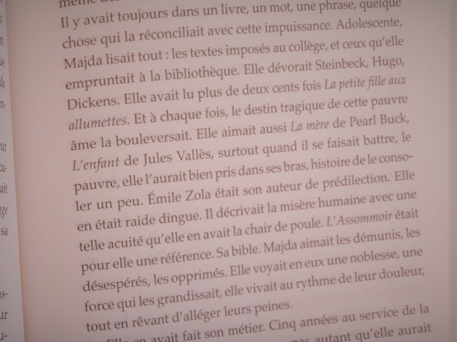 « Majda avait un don absolu pour comprendre le malheur, et cela dès l’adolescence. Les livres qu’elle dévorait fourmillaient d’histoires malheureuses. Il y avait toujours, dans un livre, l’évocation de sa propre histoire, la preuve que l’humanité partage les mêmes maux, la même désolation, la même impuissance à consoler ses peines. Il y avait toujours dans un livre, un mot, une phrase, quelque chose qui la réconciliait avec cette impuissance.«