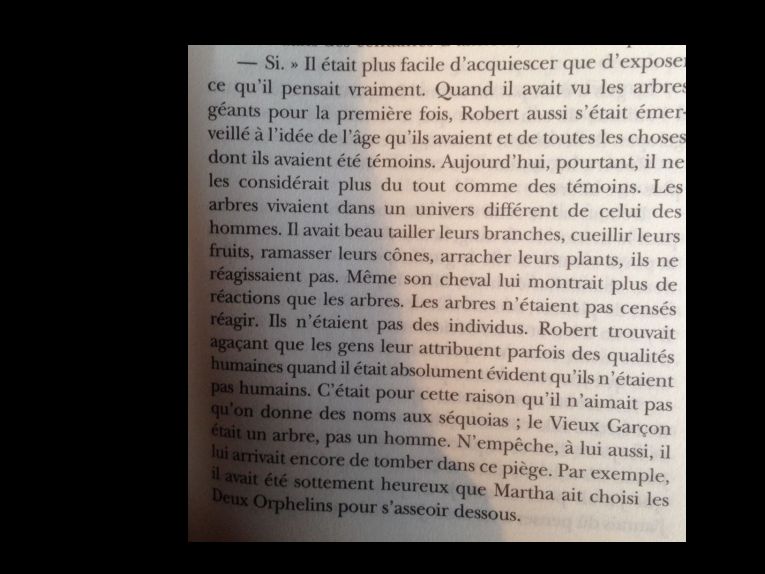 Les arbres font figure de métaphores dans l’exploitation du thème abordé. Ils sont toujours présents aux moments clés de l’histoire et Robert retrouve parmi eux une sorte de sérénité, bien qu’il leur reconnaisse un statut tout à fait différent de celui de l’être humain …..